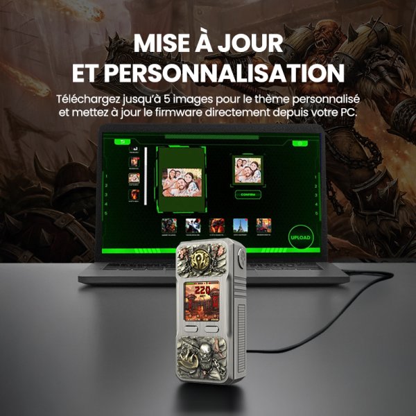 Avec le mod Rayden 220 Orgrim Limited Edition, entrez dans l’univers brutal et indompté des Orcs, où force, honneur et guerre règnent en maîtres absolus.Chaque mod est une pièce artistique unique aux finitions jamais atteintes dans le monde de la vape.Fonctionne avec deux accus 18650.Nouveau chipset XT Ultra GT 220 V1.0.Bypass ou Power avec 5 modes d'utilisation : MTL, Soft, Normal, Hard et Pro (courbe de puissance personnalisée).Puissance réglable de 5 à 220 watts.Personnalisation avancée grâce à une multitude de thèmes sélectionnables ainsi qu'un "custom" permettant d'importer une image depuis un PC.Logiciel dédié permettant à la fois de mettre à jour et de personnaliser l'interface du mod, et qui apportera de nouvelles fonctionnalités prochainement.Parfaitement affleurant avec les atomiseurs d'un diamètre maximal de 26mm.Corps en aluminium brossé avec usinage CNC.Edition limitée à 3000pcs dans le monde.Prix de vente conseillé 139.00€